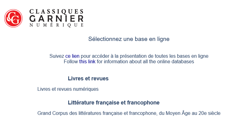 Databáze Classiques Garnier Numérique zpřístupňuje texty odborných knih pro literární vědu a humanity, francouzská a frankofonní literární díla, primární prameny, slovníky a encyklopedie.